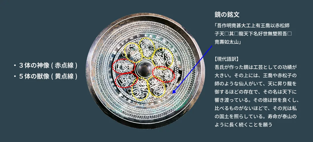 鏡の縁の部分が断面で見ると三角で、神獣の模様がある鏡を「三角縁神獣鏡」といいます。コヤダニ古墳出の三角縁神獣鏡は三神と五獣の模様があるので、「三角縁三神五獣鏡」になります。