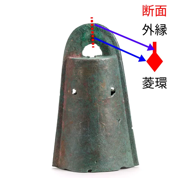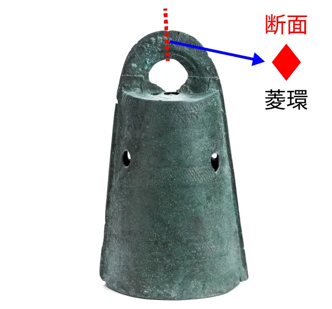 吊り手の鈕の断面が菱形をしています。それが環状に(正確には逆U字型)なっているので「菱環鈕式」と命名されています。