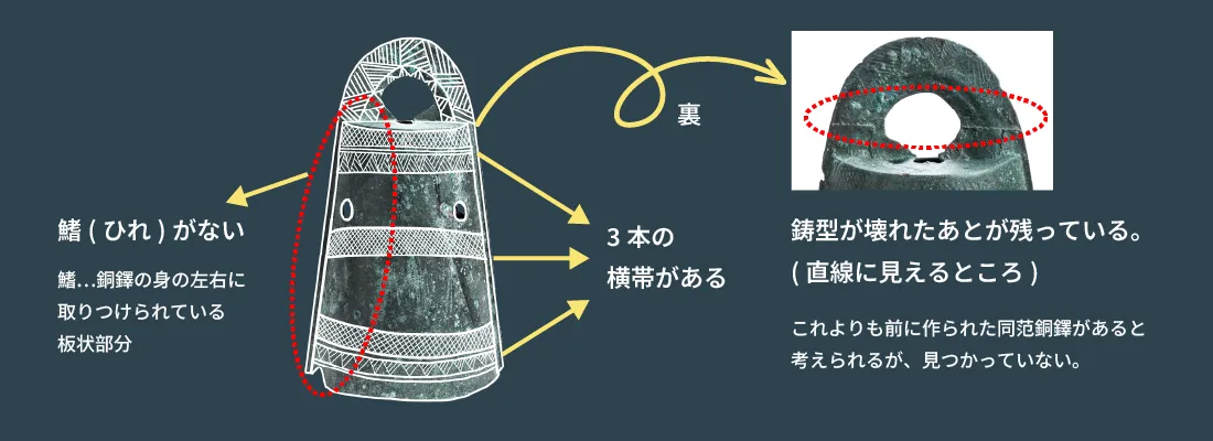吊り下げるひもの跡が確認できたのは、全国で初めて。これまでに発見された銅鐸は実年代を判定できるものが伴っていたものはなかった