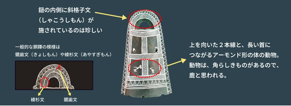 日光寺銅鐸(南あわじ市:国重要文化財)と同じ鋳型で造られた同笵(どうはん)銅鐸で、兄弟銅鐸ともいわれる