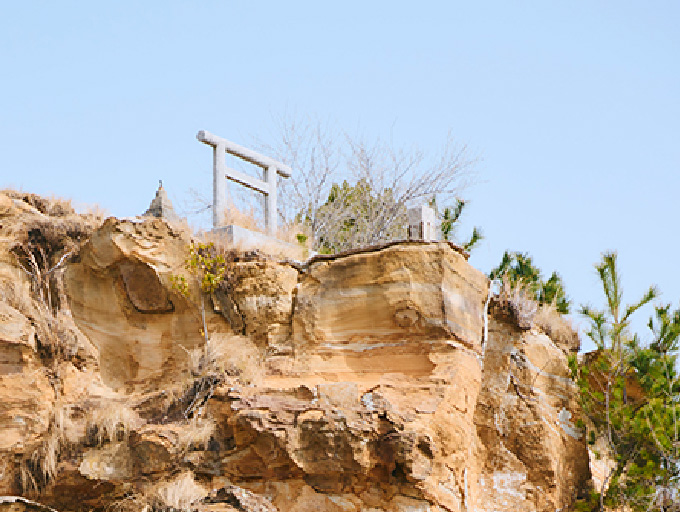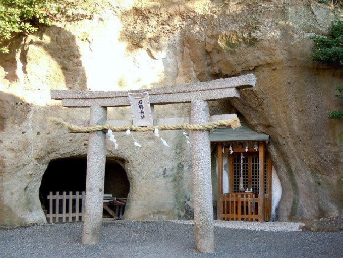 絵島から国道を渡ると目の前に岩屋城が築かれた標高130mの山があります。西へ回ると城山の北端、崖下の洞窟に伊弉諾尊・伊弉冉尊・蛭子命を祀る岩楠神社が鎮座しています。