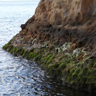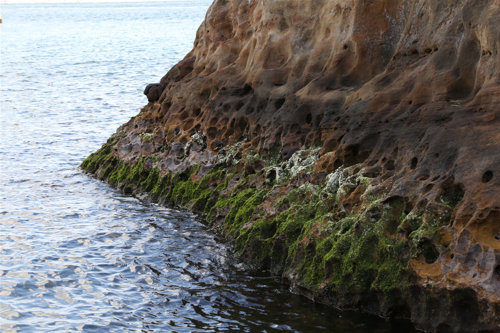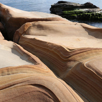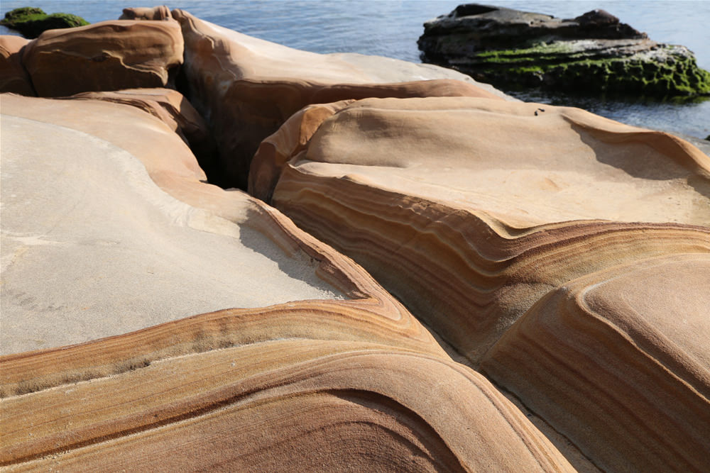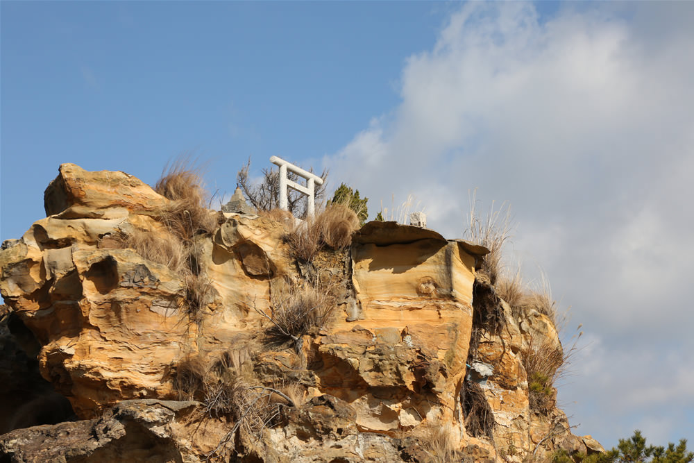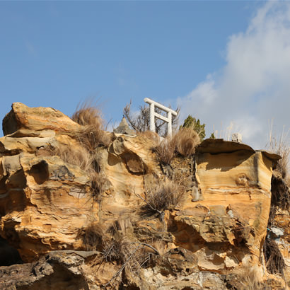 この島は、約3,800万~3,500万年前に形成された砂岩層でできており、それが長年の風や波の浸食によって今の姿を作り出しています。砂岩層に生じた割れ目や地層面に沿って地中の鉄分が酸化することによって、茶色から黄色にかけて何段階かの色に変色した褐鉄鉱(かってっこう)が沈着し、美しい縞模様が描き出されています。岩肌には、ところどころに丸い赤褐色の石が見られます。