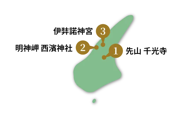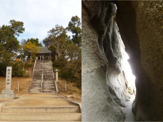 イザナギノミコト・イザナミノミコトが最初に創った山だとされる先山に位置する古刹『千光寺』、2柱の神を祀る西濱神社がある明神崎には海を一望できる展望台や海に面した岩場に洞窟があり、くぐり抜けると生まれ変わるというパワースポットです。2柱の神にふれる盛りだくさんのコースです。