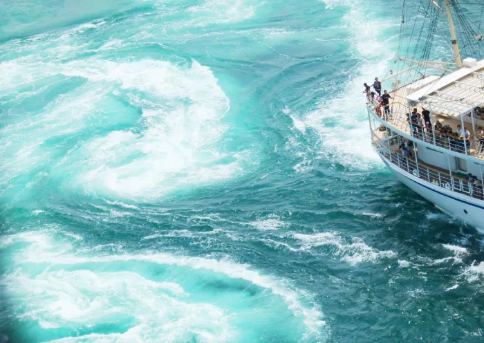 二柱の神様が沼矛で下界をかき回し、落ちた塩の雫からおのころ島が生まれた描写は、「海人(あま)」が生業とした塩づくりの様子に重なります。また、沼矛でかき回すことによって下界が渦巻くさまを記した場面は、海人が活躍した鳴門海峡の巨大な渦潮を想像させます。