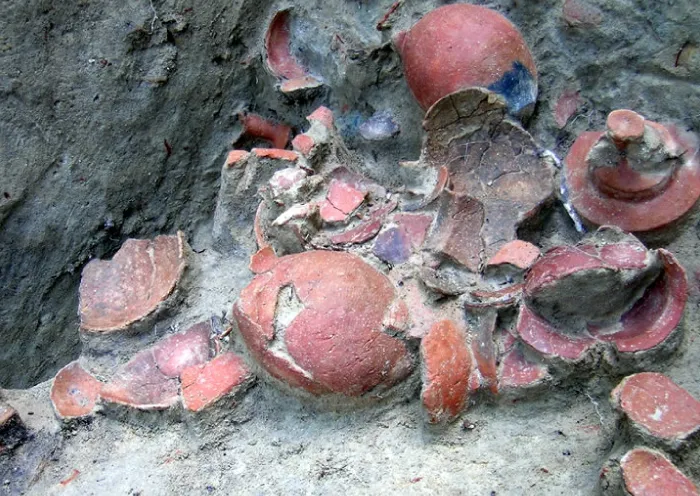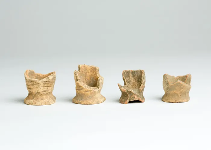 1世紀に鉄器の生産を開始した五斗長垣内遺跡では、100年以上継続した鍛冶工房の跡や朝鮮半島からもたらされた鉄斧などが出土。海の民の手によって、金属器とともに先端の技術と文化が伝えられたとされます。二ツ石戎ノ前遺跡では、辰砂を原料とする朱の精製を行った工房跡も発見されました。